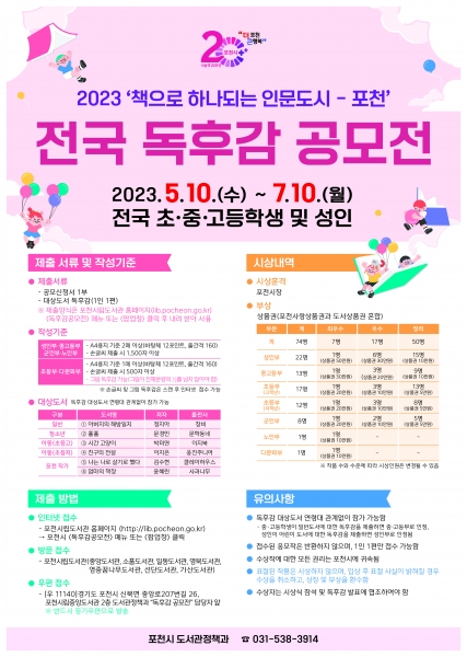 시 관계자는 “품격있는 인문도시 구현을 위해 추진한 포천시 올해의 책 전국 독후감 공모전에 관심있는 시민들의 많은 참여를 부탁드리며 시 승격 20주년을 맞아 포천시 올해의 책을 시민들이 함께 읽고 즐기는 2023년 한 해가 되길 바란다”고 전했다.