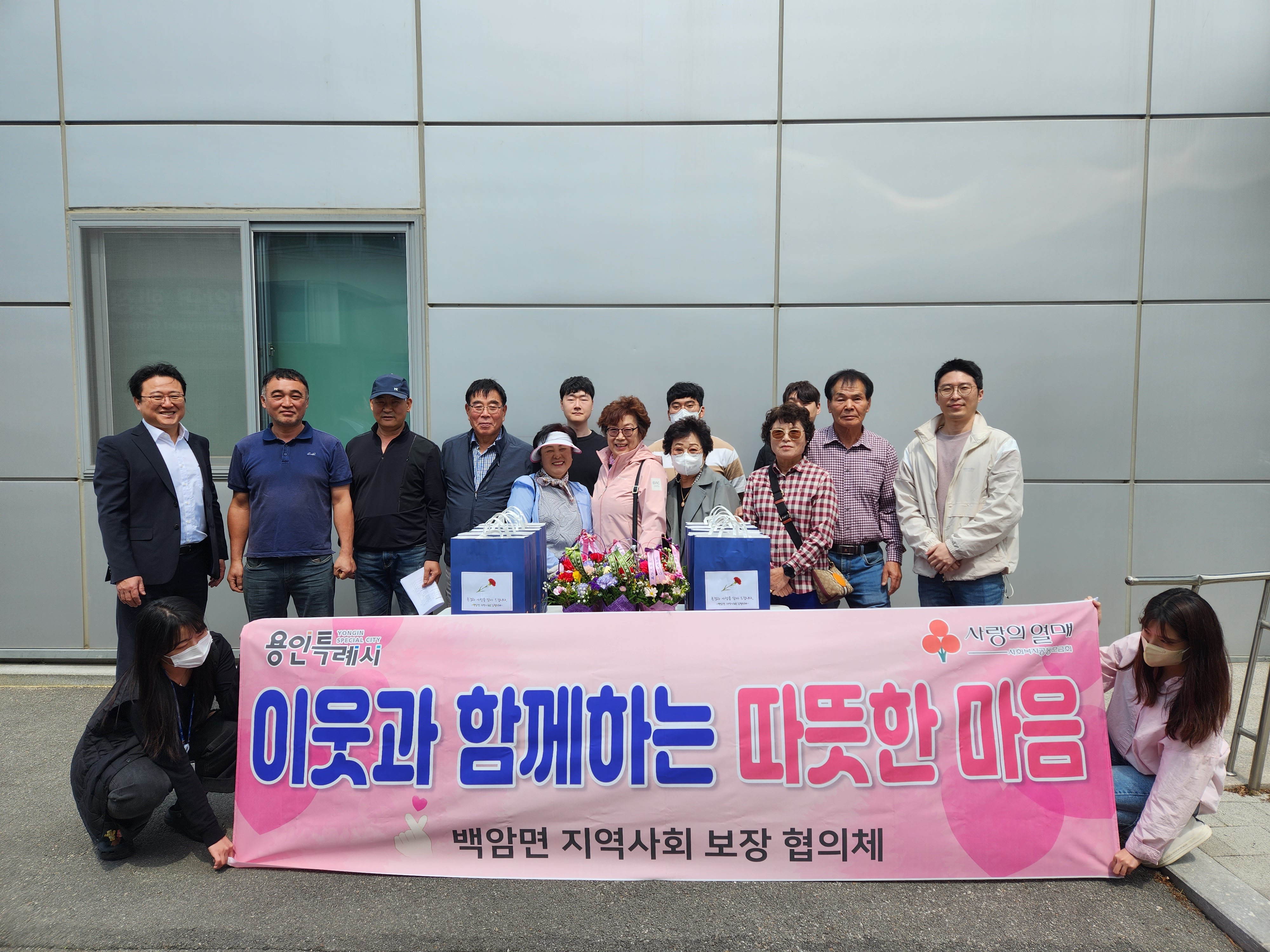 ▲ 처인구 백암면 지역사회보장협의체(위원장 신명철) 홀로 어르신 10가구에 카네이션과 간식꾸러미 전달