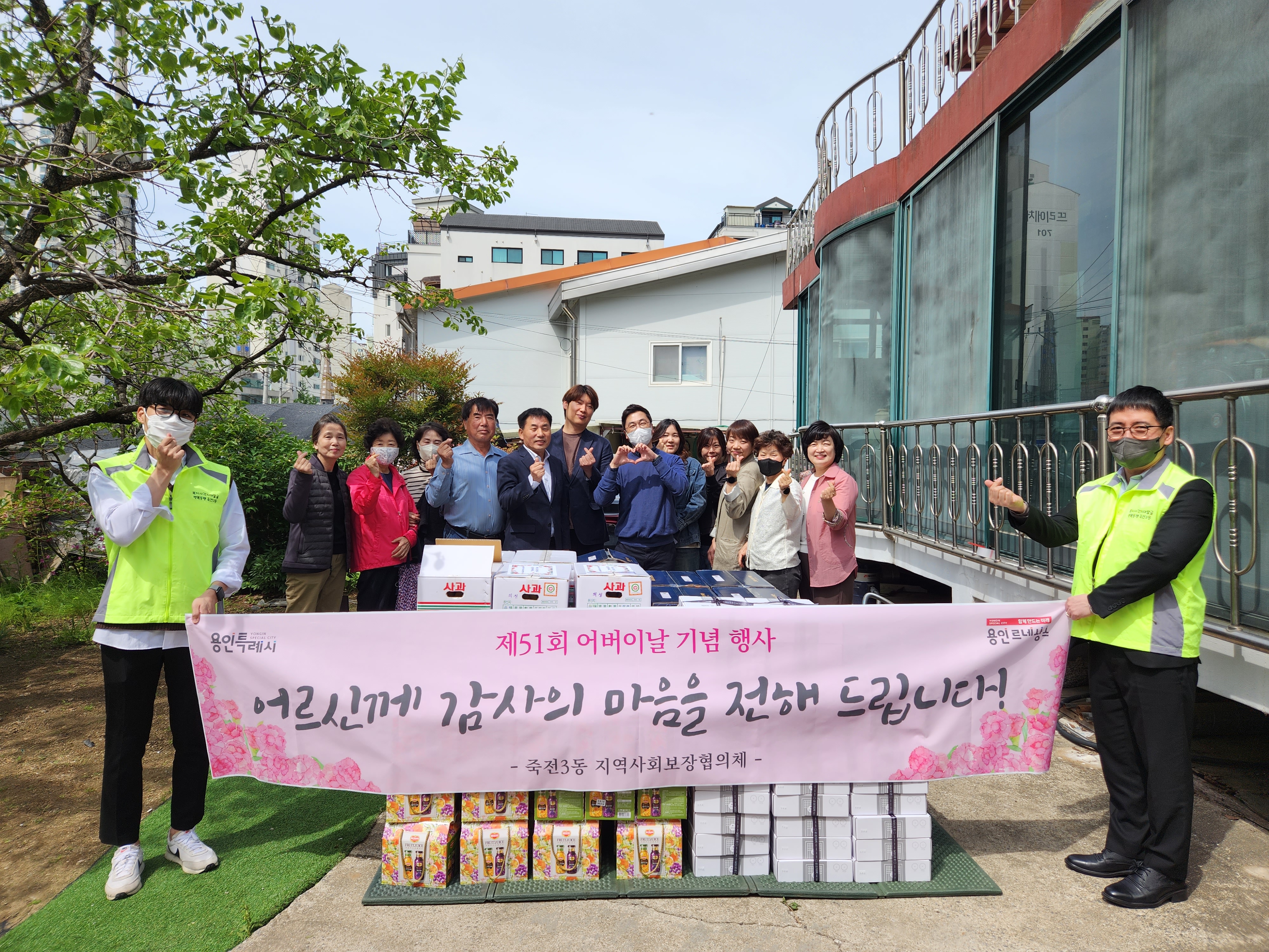 ▲ 수지구 동천동 지역사회보장협의체(위원장 이정열) 저소득 어르신 12명에게 3만원 상당 한정식과 카네이션 전달