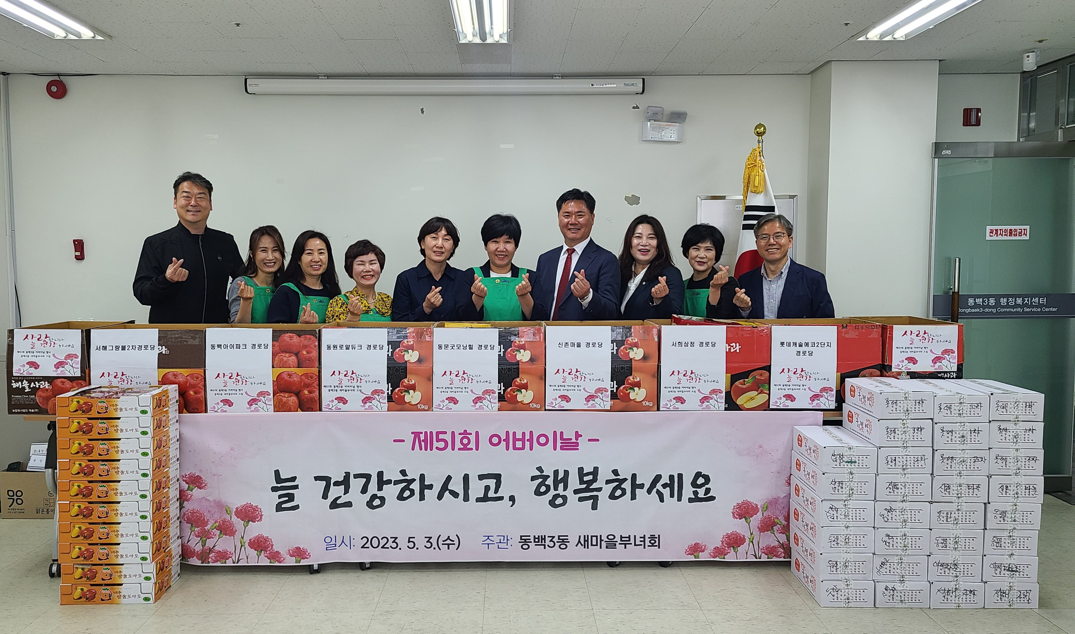 ▲ 기흥구 동백3동 새마을부녀회 (회장 김민주) 관내 9개 경로당 떡과 과일 등 음식 전달, 지역 단체장들 동참