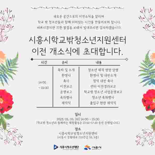 [금요저널] 시흥시청소년재단 산하기관인 시흥시학교밖청소년지원센터 고일영)가 새로운 공간으로 이전하면서 오는 9일 오후 2시, 정왕어울림국민체육센터 3층에서 ‘이전 개소식’을 진행한다.