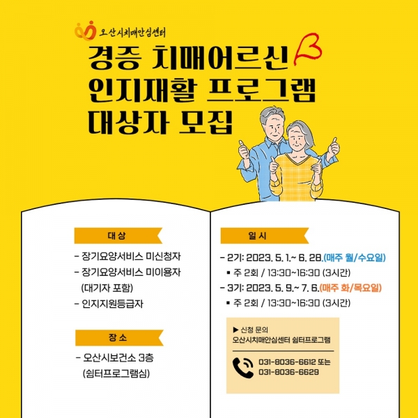 프로그램은 오산시보건소 3층 쉼터프로그램실에서 치매안심센터에 등록된 경증 치매 환자 중 장기요양서비스 미신청자 등을 대상으로 2기와 3기로 나누어 진행된다.