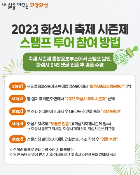 스탬프 투어 참여 방법은 스마트폰에서 ‘화성시축제시즌제’를 검색해 앱을 설치한 후 축제장에 설치된 통합홍보부스를 방문, QR코드를 스캔하면 된다.