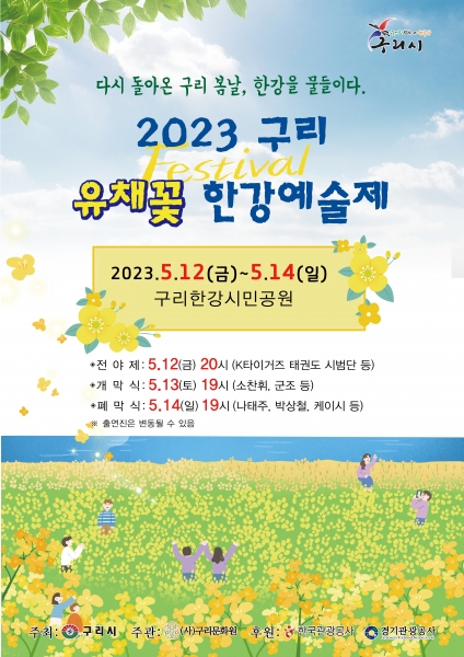[금요저널] 구리시는 오는 5월 12일부터 14일까지 3일간 구리한강시민공원에서 구리시 대표 봄 축제인 ‘2023 구리 유채꽃 한강예술제’를 개최한다고 밝혔다.
