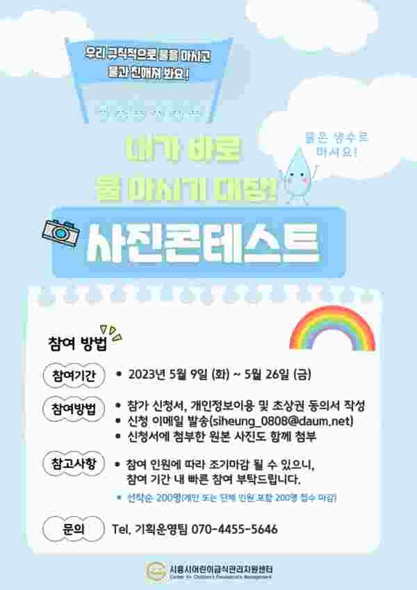 [금요저널] 시흥시어린이급식관리지원센터가 등록기관 및 학부모를 대상으로 5월 9일부터 26일까지 ‘내가 바로 물 마시기 대장’ 사진 콘테스트 접수를 받는다.