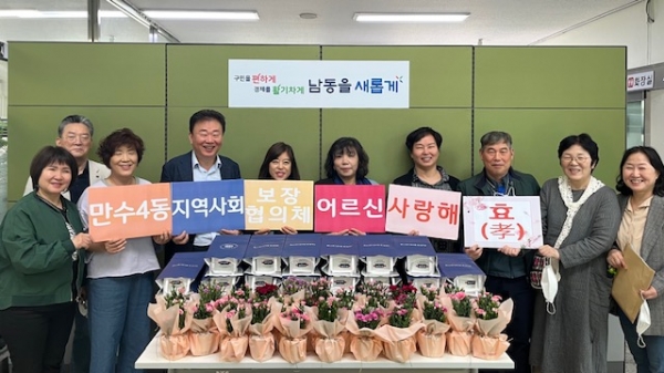 이번 행사는 만수4동 지역사회보장협의체에서 추진하는 ‘사랑해 효’ 사업의 일환으로 지역사회보장협의체 위원들이 어르신 가구를 직접 방문해 카네이션 화분과 롤케이크를 전달하고 어르신들의 안부를 살폈다.
