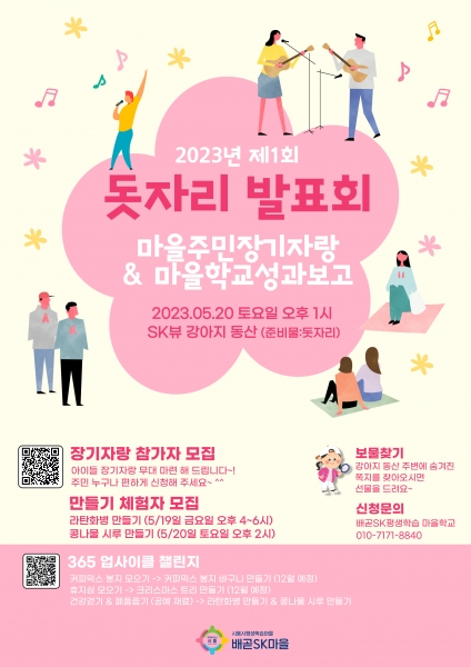 특히 배곧동의 ‘배곧SK평생학습마을학교’는 오는 20일 ‘돗자리발표회’를 개최해 마을학교프로그램 발표 및 전시와 함께 마을주민 누구나 장기자랑에 참여할 수 있는 공동체 행사를 마련한다.