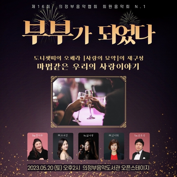 5월 20일 오후 2시에는 의정부음악협회의 정기음악회 ‘부부가 됐다’로 도니제티의 오페라 ‘사랑의 묘약’ 스토리를 가요, 영화음악, 드라마OST, 뮤지컬로 재구성한 음악들을 선보인다.