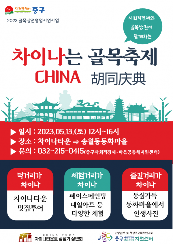[금요저널] 인천 중구 사회적경제·마을공동체 지원센터는 5월 가정의 달을 맞이해 관내 골목상권에 활기를 불어넣기 위해 오는 13일 오후 12시부터 차이나타운과 동화마을 일대에서 ‘사회적경제와 골목상권이 함께하는 ‘차이나는 골목축제’’를 개최한다고 밝혔다.