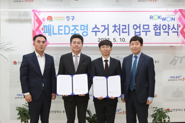[금요저널] 인천시 중구는 10일 ㈜록원과 폐LED조명 재활용 활성화 추진을 위한 업무협약을 체결했다.