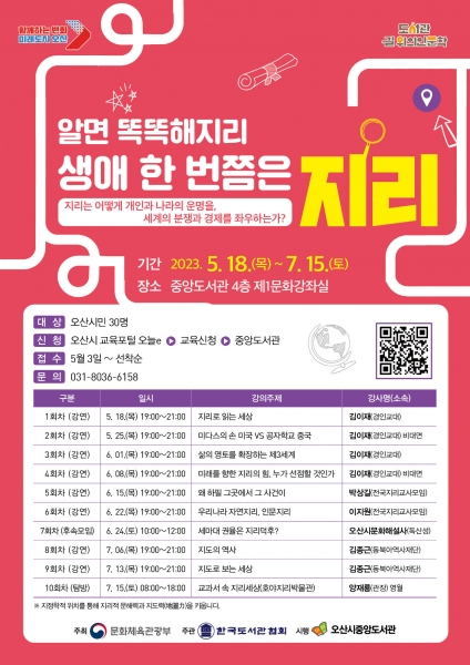오는 18일부터 7월 15일까지 10회에 걸쳐 매주 목요일 저녁 7시 오산시 중앙도서관에서 진행하며 10회차에는 국내 유일 지리박물관인 호야지리박물관을 탐방할 예정이다.