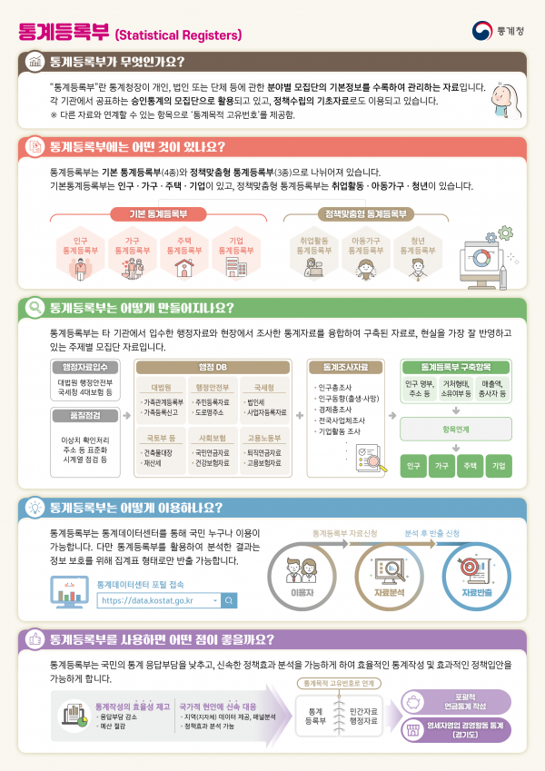통계청은 인구·가구·주택통계등록부 및 기업통계동록부를 기본으로 취업활동통계등록부, 아동가구통계등록부, 청년통계등록부 등 정책맞춤형 통계등록부까지 총 7종의 통계등록부를 구축·관리, 개방하고 있다.