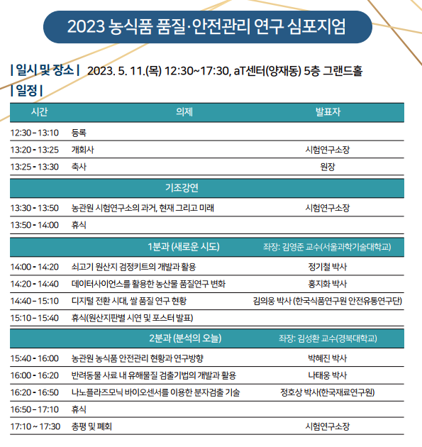 [금요저널] 국립농산물품질관리원 시험연구소는 5월11일 오후 1시에 에이티센터 그랜드홀에서 농식품 품질·안전 연구 관련 기관·단체를 초청해‘2023 농식품 품질·안전관리’학술토론회을 개최했다.