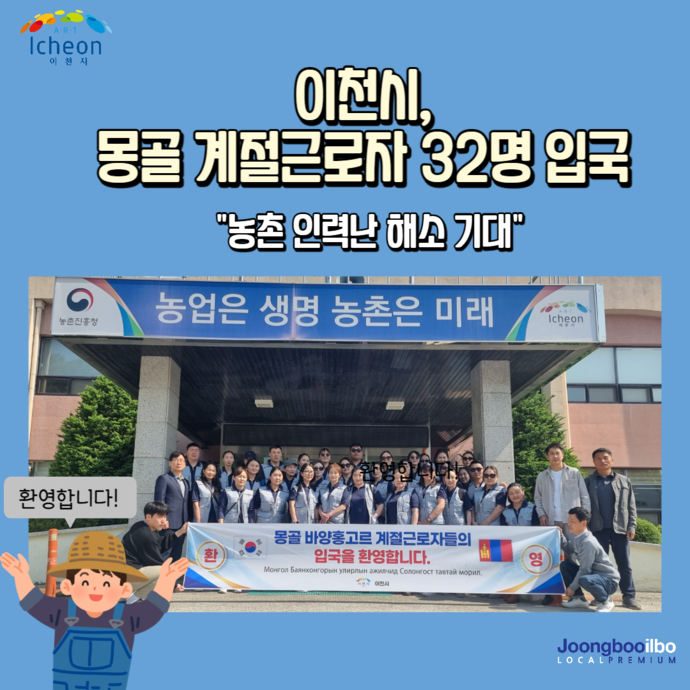 몽골 계절근로자 32명은 지난 11일 이천시 농업기술센터에서 ▶환영식 및 마약검사 ▶사전교육 ▶산재보험 가입 절차 등을 거쳐 농가에 배치됐다.