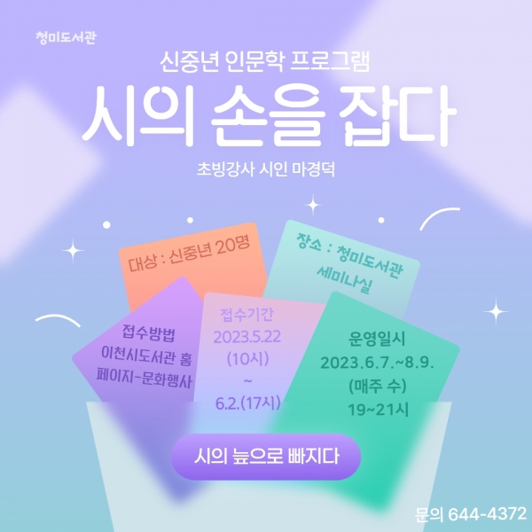 [금요저널] 이천시청미도서관에서는 6월 7일부터 8월 9일까지 중년 인문학프로그램‘시의 손을 잡다’을 운영한고 밝혔다.