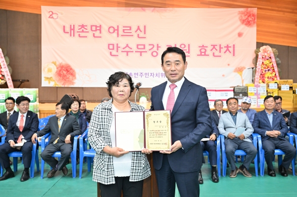 이날 행사에 참석한 백영현시장은 “오늘 어르신들의 얼굴에 활짝 핀 웃음꽃을 보니 정말 기쁘다 내촌면에 다양한 사업들을 계획하고 있고 면 숙원사업을 위해 지원을 아끼지 않을 것이다 우리 어르신들께서도 건강하게 오래오래 사셔서 우리 내촌면의 발전을 지켜봐 주시기 바란다”고 말했다.