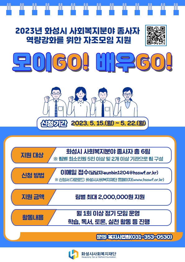 재단에서 올해 새롭게 선보이는 ‘모이GO 배우GO’ 신규 사업의 지원 자격은 월 1회 이상 정기 활동 실시 가능한 화성시 사회복지분야 종사자 5인 이상으로 구성된 팀으로 활동에 필요한 교육비, 강사비, 도서 구입비 등을 지원받을 수 있다.