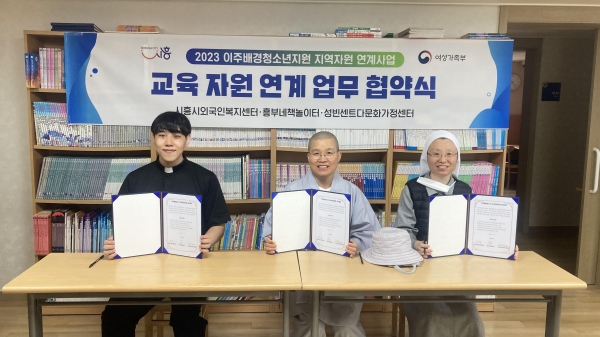 [금요저널]시흥시와 시흥시외국인복지센터가 지난 12일 흥부네책놀이터, 성빈센트다문화가정센터와 함께 교육자원 연계 업무협약을 맺고 정왕지역 이주배경 아동 지원에 나섰다.
