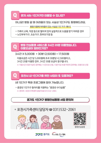 [금요저널] 포천시는 올해 4월부터 포천시가족센터를 통해 홀로 병원 가기 어려운 관내 1인가구, 유사 상황에 놓인 실질적 1인가구를 대상으로 병원 안심동행서비스를 추진하고 있다.