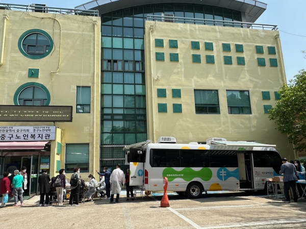 [금요저널] 인천시 중구는 지난 8일 중구노인복지관 마당에서 대한결핵협회 인천시지부 검진사업팀과 협력해 ‘찾아가는 어르신 결핵 검진’을 진행했다.