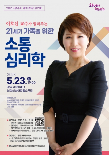 이번 강연은 이호선 숭실사이버대학교 교수가 강사로 초빙돼 ‘21세기 가족을 위한 소통 심리학’을 주제로 광주시민들을 대상으로 강연할 예정이다.