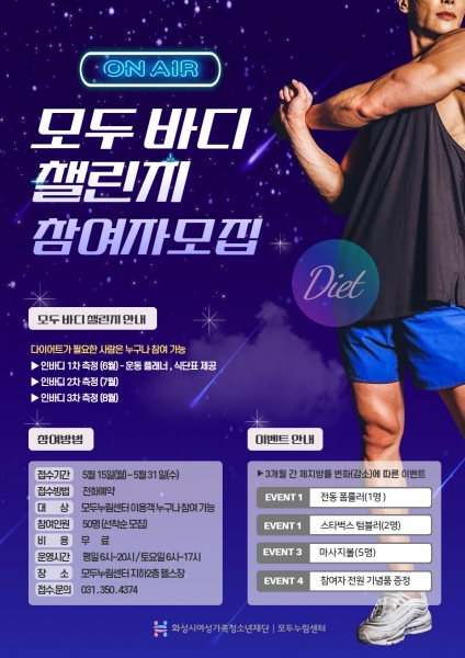 [금요저널] 화성시여성가족청소년재단 모두누림센터에서는 건강 유지와 체중 관리에 관심이 있는 시민 대상으로 2023년 5월 15일부터 2023년 5월 31일까지 ‘2023년 모두바디챌린지’ 참가자를 모집한다.