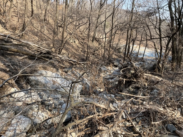 계곡 주변 경사면을 보강하고 등산객이 안전하게 계곡을 건너도록 돌다리를 만들었다.