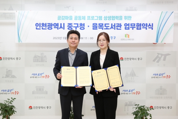 김정헌 인천 중구청장과 이미아 율목도서관장은 지난 12일 중구청 구청장실에서 이 같은 내용을 골자로 한 ‘공감마을 공동체 프로그램 상생협력을 위한 업무협약’을 체결했다.