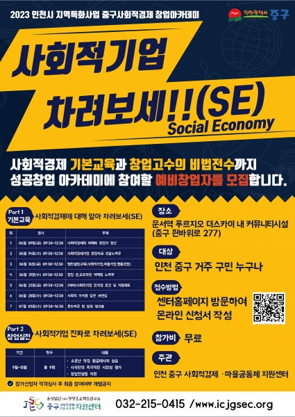 [금요저널] 인천 중구 사회적경제·마을공동체 지원센터는 올해 6월부터 열릴 ‘찾아가는 사회적경제 창업아카데미 - 사회적기업 차려보세’에 참여할 교육생을 모집한다고 17일 밝혔다.