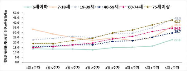 모든 연령대에서 전주 대비 일평균 발생률 증가했다.