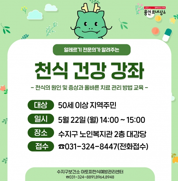 [금요저널] 용인특례시 아토피 천식 예방관리센터는 오는 22일 수지구 노인복지관 2층 대강당에서 천식의 올바른 치료와 관리 방법 등을 알려주는 건강 강좌를 연다.