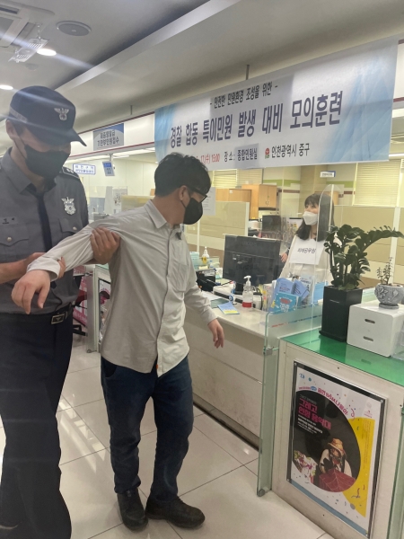 이번 훈련은 특이 민원에 의한 폭언·폭행 등 민원실 근무 중에 발생할 수 있는 비상 상황으로부터 민원인과 공무원을 보호할 수 있는 역량을 강화하고 중부경찰서와의 협력체계를 강화하기 위해 실시됐다.