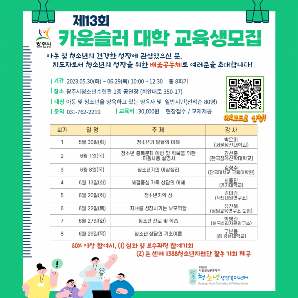제13회 카운슬러대학 기초과정은 80명을 선착순 모집하며 문의 및 신청은 광주시 청소년상담복지센터로 하면 된다.