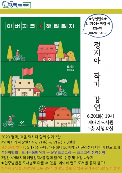 [금요저널] 평택시 시민독서운동 ‘평택, 책을 택하다’ 2023년 올해의 책 ‘아버지의 해방일지’ 정지아 작가 강연이 오는 6월 20일 저녁 7시에 배다리도서관에서 열린다.