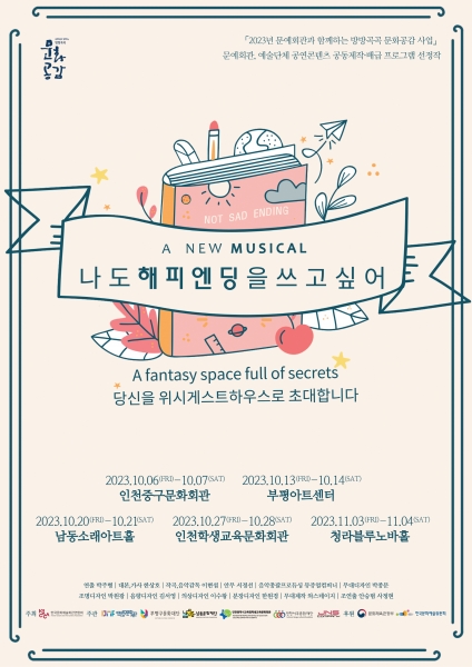 ‘나도 해피엔딩을 쓰고 싶어’는 오는 10월 초 중구문화회관에서의 공연을 시작으로 부평아트센터, 남동소래아트홀, 학생교육문화회관, 청라블루노바홀에서 10회에 걸쳐 관객들과 함께할 예정이다.