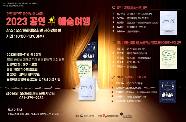 ‘공연 밖 예술여행’은 오산문화예술회관이 중심이 돼 연극, 클래식, 오페라 감상의 가치를 지역주민에게 제공함으로써 생활 속 인문 활동을 확산하기 위해 운영되는 사업이다.