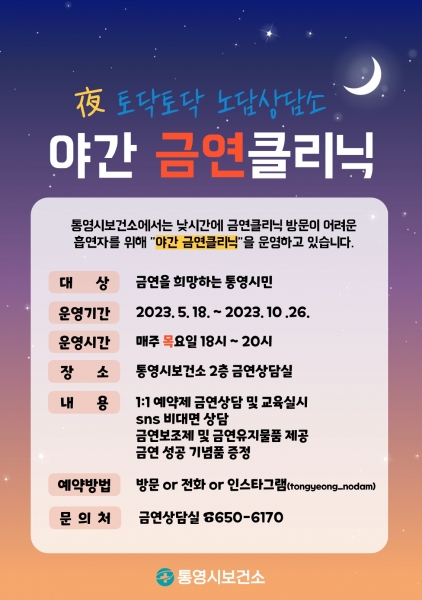 통영시보건소 관계자는 “야간 금연 클리닉을 통해 금연 의지를 가진 분들이 시간적 제약을 극복하고 체계적인 금연지원 서비스를 받을 수 있길 기대한다”며 “앞으로도 담배연기 없는 건강도시 통영을 조성하기 위해 다양한 금연지원 서비스를 제공하겠다"고 밝혔다.