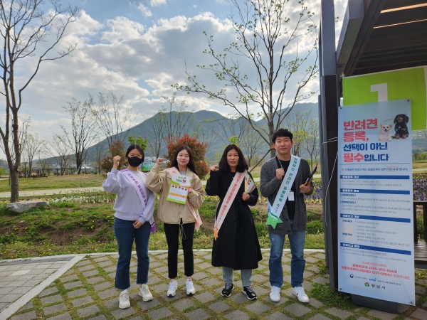 [금요저널] 양산시에서는 4~5월 기간동안 시민들이 반려견들과 즐겨 찾는 황산공원 등지에서 시 공무원들과 명예동물보호관 20여명이 합동으로 동물등록제와 펫티켓 집중 홍보캠페인을 실시했다.
