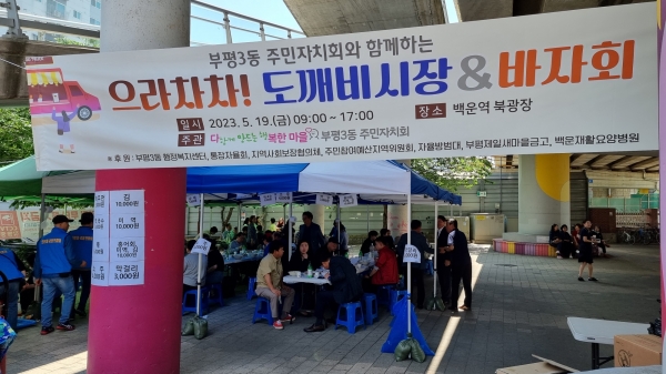 [금요저널] 부평구 부평3동 주민자치회는 지난 19일 백운고가 하부 백운역 북광장에서 주민 300여명이 참여한 가운데 ‘으라차차 도깨비 시장’ 바자회를 진행했다.