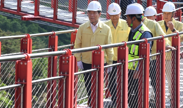 이날 민관 합동 점검팀은 Y자형 출렁다리의 바닥판 균열 및 손상상태, 케이블, 교각 및 교대 상태, 기타 부대시설 등에 대해 정밀 안전진단을 시행했으며 점검결과는 매우 안전한 것으로 판단됐다.