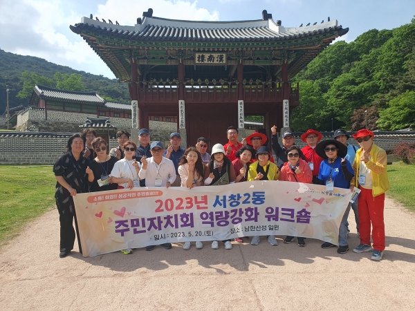 이날 워크숍은 올해 주민총회 중점 사업인 ‘다함께 우리 동네 한바퀴’의 벤치마킹을 위해 경기도 화담숲과 남한산성을 방문해 공원 및 산책로 주변 개선 방안을 살펴봤다.