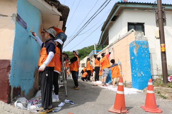 이날 봉사에 참여한 박미자 상패동 6통장은 “이 골목에 이렇게 많은 사람이 있는 것이 정말 오랜만이다. 페인트만 칠했는데도 동네 골목이 훤해지고 희망이 생기는 기분이다. 거주하는 사람도 또 오가는 사람도 절로 미소 짓는 행복한 골목이 되면 좋겠다”고 전했다.