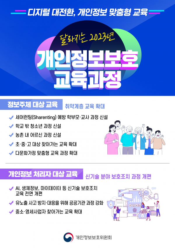 아울러 ‘학교밖 청소년’과 ‘농촌 거주 어르신’을 대상으로 하는 교육과정을 신설해, 생활밀착형 개인정보 보호 방법과 피해구제 방안 등을 중점 교육한다.