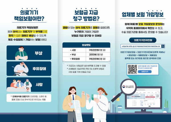 의료기기 책임보험은 인체이식형 의료기기의 부작용으로 환자가 입은 피해를 배상할 수 있도록 제조·수입업체가 가입하는 보험으로 결함이 있는 이식 의료기기로 인해 부상·후유장애 등 피해를 입었다면 누구든지 기업이 가입한 보험금 지급을 청구할 수 있다.