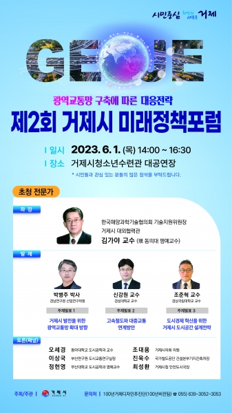 [금요저널] 거제시는 ‘광역교통망 구축에 따른 도시 발전방향 및 대응전략’이라는 주제로 제2회 거제시 미래정책포럼을 오는 6월 1일 오후 2시부터 거제시청소년수련관 대공연장에서 개최한다.