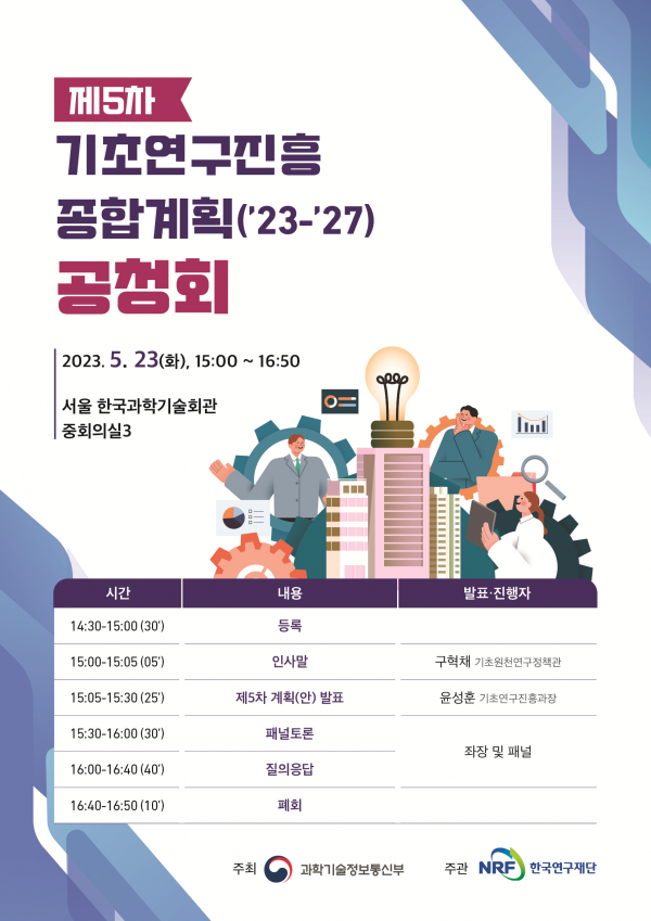 [금요저널] 과학기술정보통신부는 5월 23일 오후 3시부터 과학기술컨벤션센터에서 ‘제5차 기초연구진흥종합계획’ 수립을 위한 공청회를 개최했다고 밝혔다.
