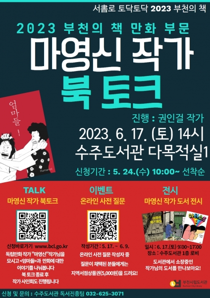 [금요저널] 부천시는 오는 6월 17일 오후 2시 수주도서관에서 2023년 부천의 책 만화 부문으로 선정된 ‘엄마들’ 마영신 작가를 초청해 북토크 행사를 개최한다.
