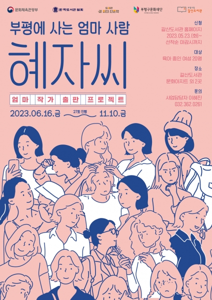 [금요저널] 부평구갈산도서관은 다음달 16일까지 문화체육관광부가 주최하고 한국도서관협회가 주관하는 ‘2023년 도서관 길 위의 인문학’ ‘부평에 사는 엄마 사람 혜자씨’ 프로그램 참여자를 모집한다.