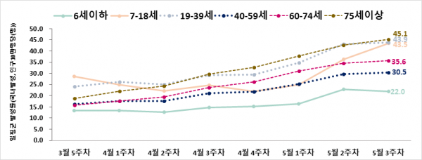 5월 3주 일평균 재원중 위중증 환자 중 60세 이상은 130명, 일평균 사망자 중 60세 이상은 10명이었다.