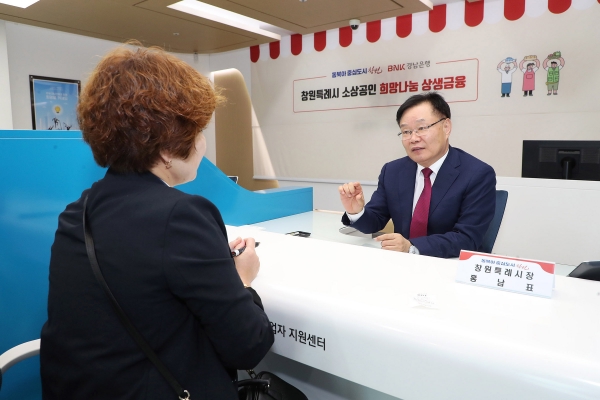 이날 홍남표 창원특례시장과 예경탁 경남은행장은 BNK경남은행 소상공인·자영업자 지원센터에서 소상공인들의 애로사항을 청취하고 대출 상담 등을 진행했다.